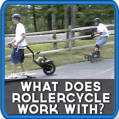 What does the Roller Cycle work with? Roller Cycle works with inline skates and skate board but also works with Terra Blades, all terrain inline skates, snow blades, long boards, mountain boards, Scorpion Skates Click here for More Info